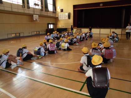 地区別に体育館に集合して、教職員引率のもと集団下校をしました。