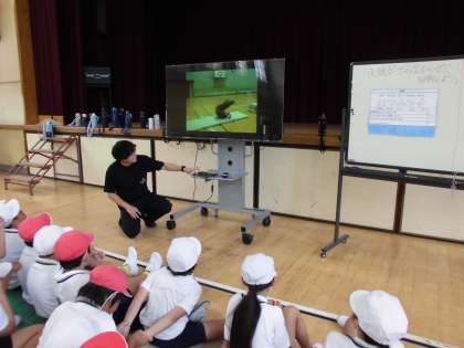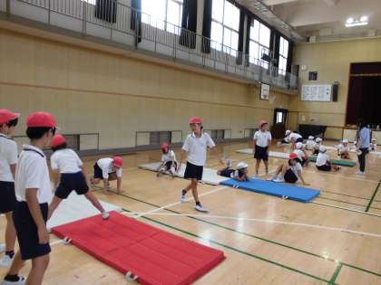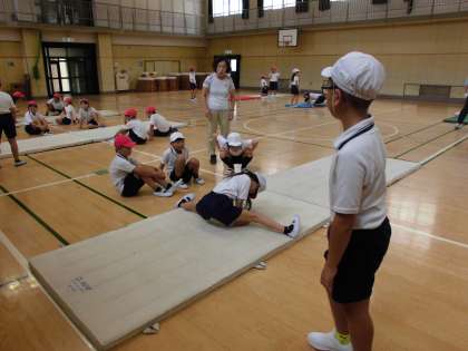 4年生は体育の時間にマット運動をしています!体育館の大型モニターに動画を映して、手をつく位置や脚の開き方などを確認しながら活動しました!