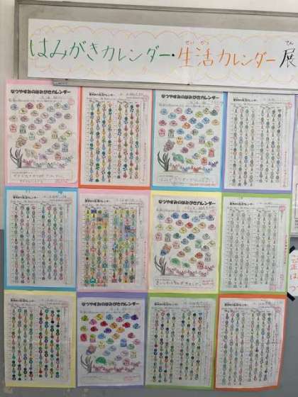 夏休み「歯磨き生活カレンダー」を保健室前に掲示しています!夏休み中に歯磨きや規則正しい生活を頑張った人のカレンダーを保健委員会のみんなで選びました!