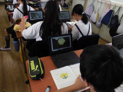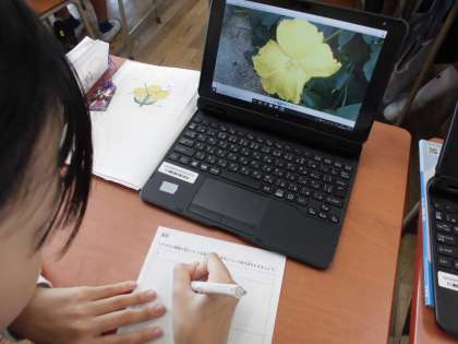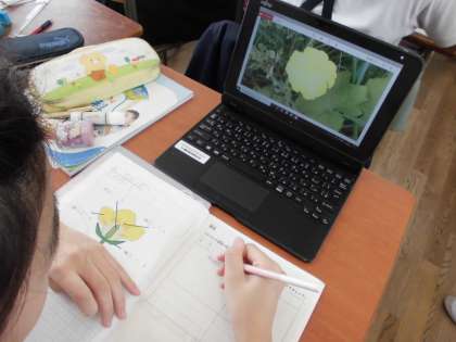 5年生が理科の学習でヘチマの花の様子をタブレットで撮影して観察しています。