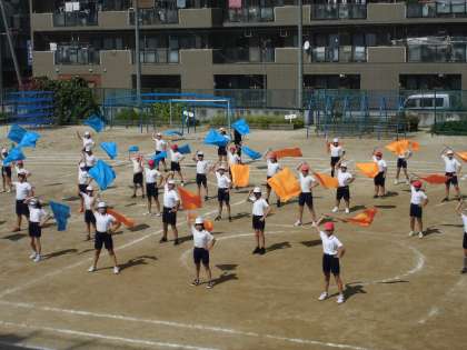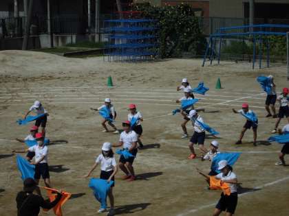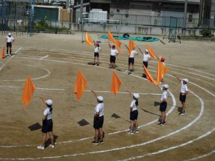 今年はフラッグを使った団体演技で、並ぶ位置やフラッグの高さなどを全体で揃えました!