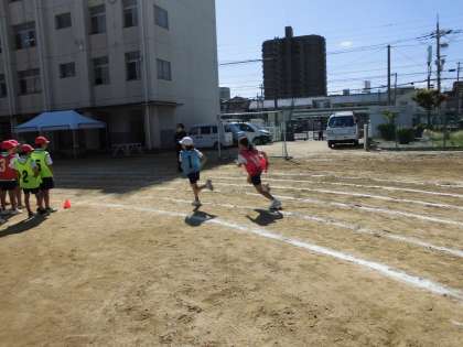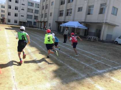 今日は5年生が運動場でリレーをしました。