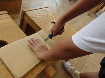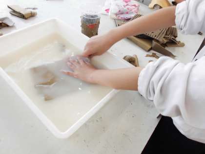 だんボールをちぎったり、濡らしたり、貼り付けたり!!