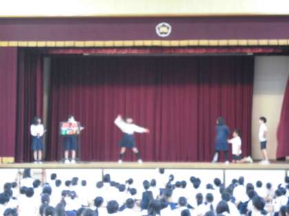 集会委員の児童が舞台上でジェスチャーをして何を表しているか当てるゲームです!!