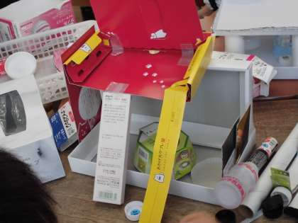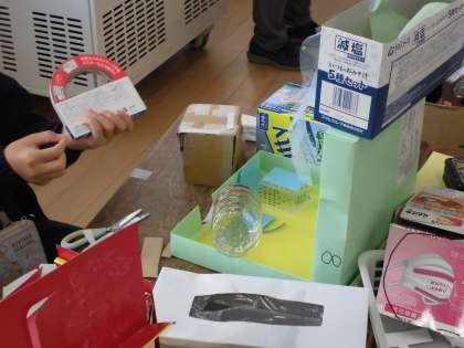 お家から集めてきた材料を工夫して、家の中にエレベーターをつけたり、屋上にヘリポートをつけたりと想像力豊かな作品がいっぱい。どんな「ともだちハウス」が完成するのか楽しみです(^^)