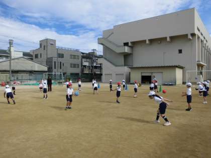 1年生が運動場で元気いっぱい体育の学習を行いました。