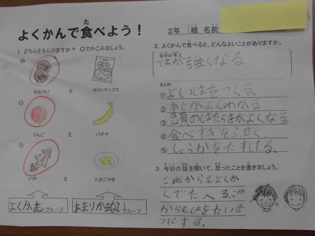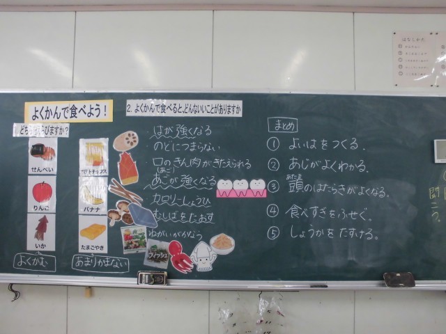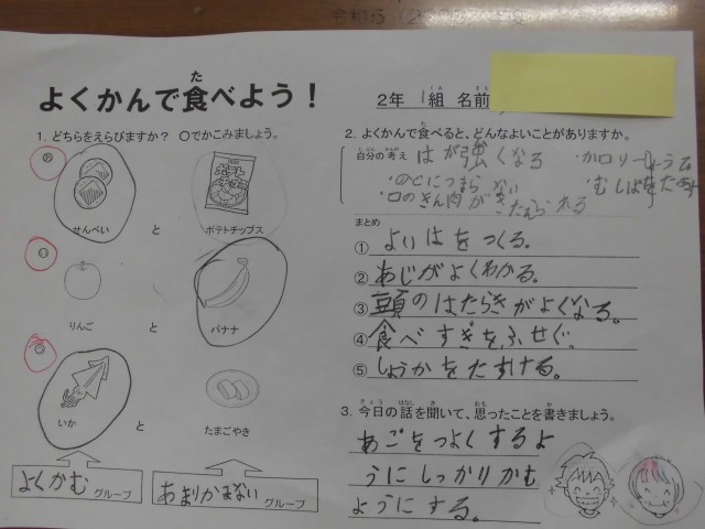 栄養教諭から、よく噛んで食べると、どんなよいことがあるのかたくさん教えていただきました。