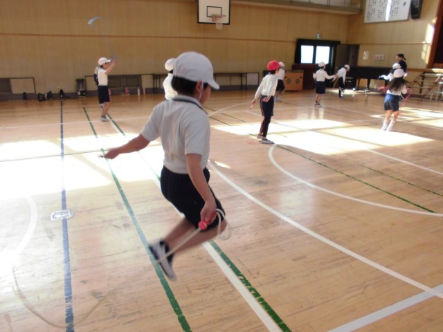 2年生が体育の時間になわとびの学習をしました。前跳びや交差跳び二人跳びなどを練習し、失敗しても繰り返し挑戦しました。