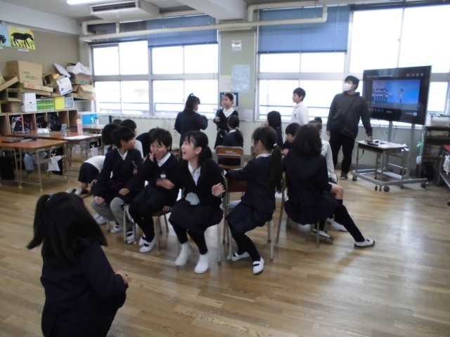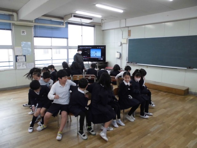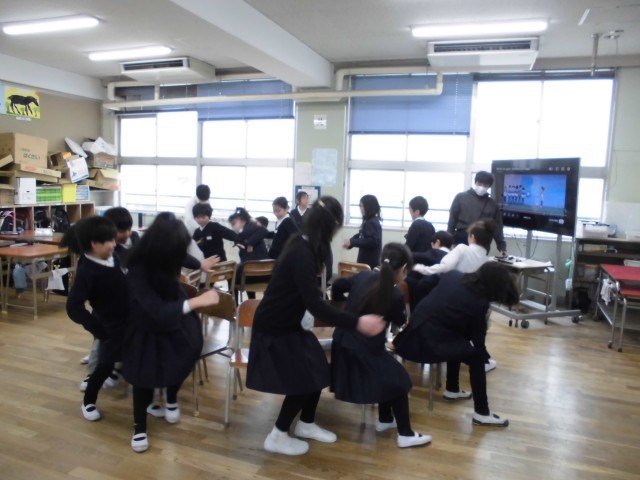 今日は雨で運動場が使えないので、20分休みのみんな遊びは教室で椅子取りゲームです!