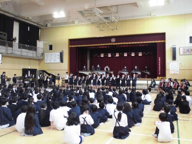 5時間目に卒業を祝う会を開催しました。在校生からはメッセージカードのプレゼント、卒業生からは迫力のある合奏を披露しました。