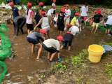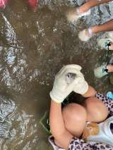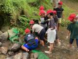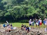 みんなで協力しながら、岩の下に手を入れて捕まえています!