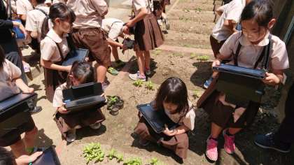 3年生から始まった理科は、「ホウセンカ」の成長について観察をもとに学習します。成長の様子をタブレットの写真機能を使って記録します。今後、継続して撮影することにより、ホウセンカの茎や葉、花がどのように成長するのか変化に気づくようにしていきます。