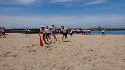 午前中のカヌーを終え、海岸に出かけお弁当を食べました。お弁当を食べた後は、ビーチフラッグ、二人三脚、すもうなど、砂浜でしかできない遊びも満喫しました。