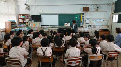 ボランティアグループ「ぐるっぽ」のみなさんにお話の読み聞かせをしていただきました。半円形に椅子をならべ、ろうそくに火をともし、静かな雰囲気のなかで、おはなしがはじまりました。学年に応じた2〜4編のおはなしや絵本の世界に、子どもたちも先生も引き込まれてしまいました。