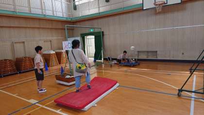 5年1組は体育館で「VS 5年」、5年2組は教室で「脱出ゲーム」をしました。「VS 5年」は動く的をボールで蹴り倒します。「脱出ゲーム」はクイズを解きながら出口をめざすゲームです。