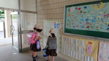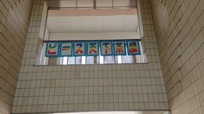 本校では、平和や命の大切さについて考え、自分たちの身近な問題(けんか、いじわる、いじめ等)と重ね合わせ、自分の生き方を見つめなおすことをねらいとして、「ピースてんがちゃや週間」を設け、子どもたちの発達段階や実態に応じて学習を行い、成果を玄関ホールに張り出しました。
