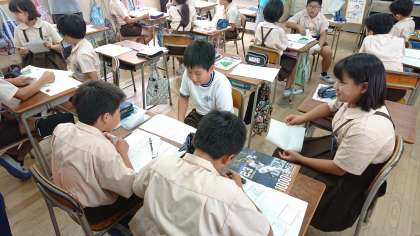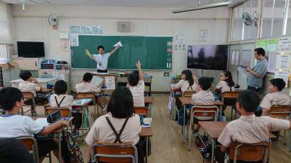 校内の授業研究会のようすです。授業は5年生「形も大きさも同じ図形を調べよう」の単元で、合同な三角形の書き方を考えました。合同な三角形とは角の大きさも辺の長さも同じ三角形であることを共有したうえで、一人ひとりで与えられた三角形と合同な三角形を書いていきました。それぞれの書き方をグループで交流することにより、合同な三角形を書くための条件に気づくようにしました。