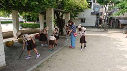 今週は1年生が当番です。保護者の方にもたくさん集まっていただき、ありがとうございました。クマゼミの抜け殻を見つけた子どももいました。梅雨明けは発表されていませんが、本格的な夏の到来です。