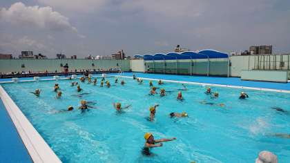 雨のため気温・水温ともに低く、昨日はプールを中止していました。今日は久しぶりに太陽が顔をのぞかせ、プール日和となりました。水慣れの後、口で吸って鼻で吐く呼吸の練習や体を1本の棒のようにして浮く練習、壁を強く蹴ってできるだけ遠くまで進む練習などを繰り返しました。最後にはダイヤモンド拾いゲームをして、楽しみました。