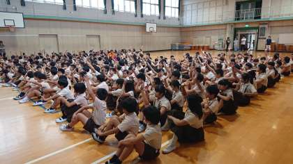 終業式は、元気に夏休みを過ごすために、1学期のがんばったこと、もう少しがんばればよかったことを振り返る日です。校長先生からは、始業式に「は」⇒話をしっかり聞く 「あ」⇒元気にあいさつをする 「と」⇒友だちをたくさんつくる、という目標に向かってがんばることができたかどうかを尋ねました。たくさんの子どもたちが手を挙げることができていました。休みにしかできないことをたくさん経験して、8/26の始業式には元気に登校してください、とお話がありました。