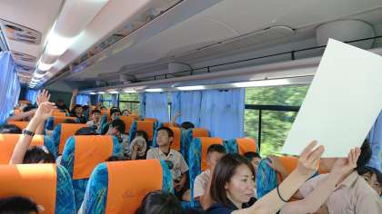 バスの中では、バスレク係が盛り上げて楽しく過ごしています。