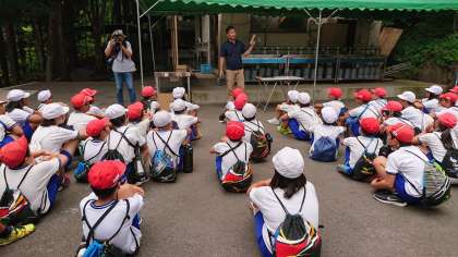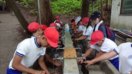 13時から高原散策の予定でしたが、天候がとてもよく気温も高いため、木陰でプログラムを変更し焼き板みがきをしました。