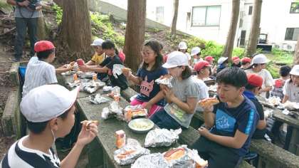 カートンドックは、ウインナー、キャベツをはさんだパンをアルミホイルで包み、牛乳パックに入れたあと、点火して作ります。牛乳パックが燃え尽きるとおいしいカートントッグの出来上がりです。