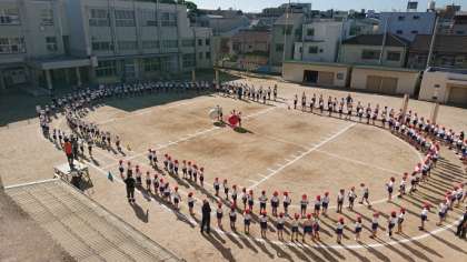 全員競技の「大玉はこび」を練習しました。低学年は転がして、高学年は高く持ち上げて次々に送っていきます。速く運ぶコツは、左右に分かれた友だちどうしでタイミングを合わせることです。さあ、本番はどちらの組が勝つでしょうか?