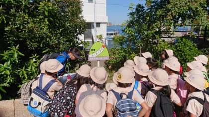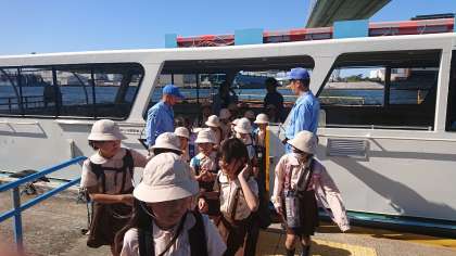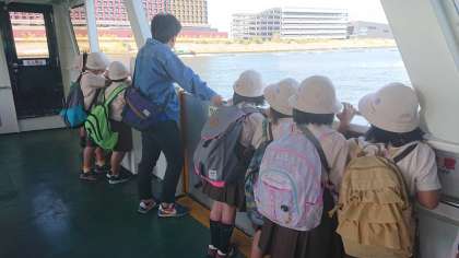お弁当が終わり、広い波止場で遊んだ後、日本一低い山として知られる「天保山」登山に出かけました。標高5.4mなので、坂を上った程度で子どもたちはきょとんとした面持ちでした。最後に渡し船に乗りました。その船は、大きな船が通る「安治川」には人が通れるような橋を架けることができないので、大阪市が「天保山渡船」を運航していると知りました。いっぱい学習できた遠足となりました。