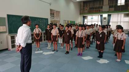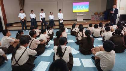 天下茶屋中学校の生徒会役員のみなさんが、6年生に対して「中学校ではこんなことをします!」というオリエンテーションをしていただきました。授業や行事、部活動のようすを画像を使ってわかりやすく説明していただきました。最後に中学校の多田校長先生から「中学校はとても楽しいところなので、安心してきてください」とお話ししていただきました。