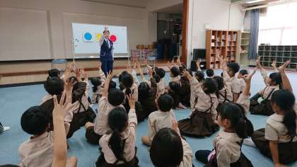 区役所のジャガパト隊のみなさんと西成警察署の警察官の方にお越しいただき、防犯及び交通安全について教えていただきました。子どもたちは「5つのやくそく」を学びました。