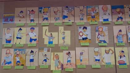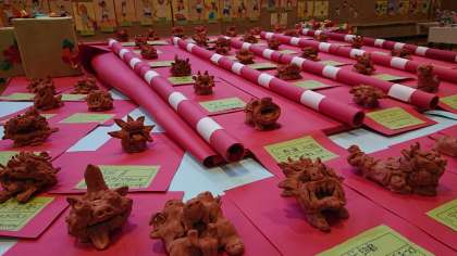 4年生は運動会で披露した「ダイナミック琉球」をテーマに、パーランクを力強く打つ姿を描きました。立体作品は赤い粘土で家の守り神である「シーサー」を作りました。