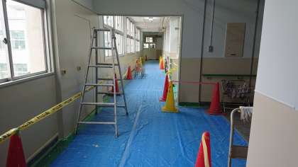 大阪市の学校園営繕グループの方々に校舎3F廊下の壁面をきれいに塗装していただいています。子どもたちには不自由をさせますが、校舎を美しく保つためにもうしばらくがまんしてくださいね。