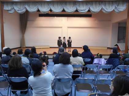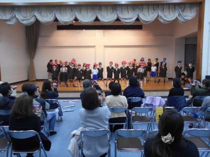 1年生は多目的室で「生活」の学習です。ピアニカ演奏や的当てなど1年間でできるようになった技を披露しました。全員で音読劇「スイミー」を行い、大きな拍手をもらうことができました。