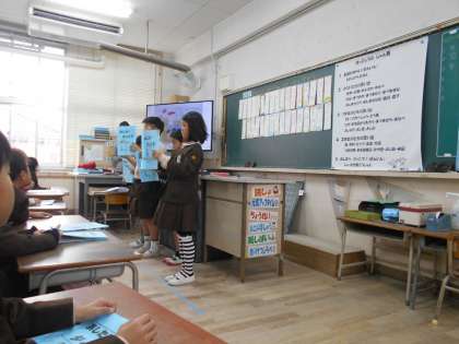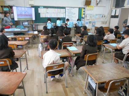 2年生は教室で「生活」の学習です。「大きくなった自分のことを伝えよう」というテーマで、今までのできごとを振り返りました。「小学校入学まで」「1年生のころ」「2年生になって」とそれぞれの時期の思い出を作文にして、発表しました。
