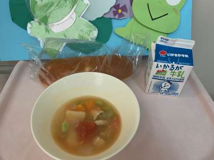 【今日の献立】おさつパン 牛乳 フレッシュトマトのスープ煮