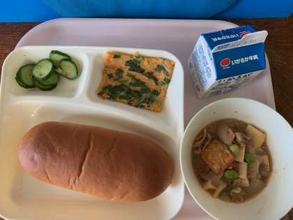 【今日の献立】黒糖パン 牛乳 豚肉と野菜の煮もの チヂミ