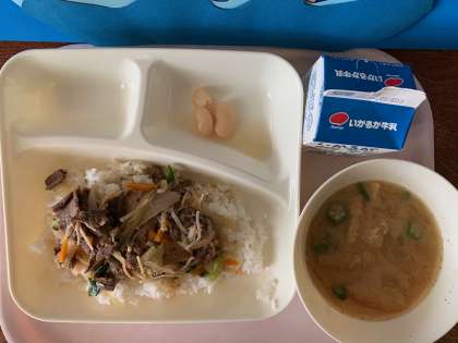 【今日の献立】牛丼 とうがんのみそ汁 大福豆の煮もの 牛乳