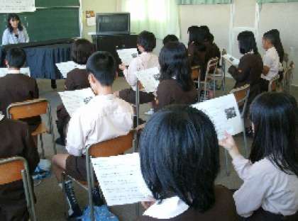 音楽と数学の授業体験の後、生徒会代表から、クラブ活動をはじめとする中学校生活や、入学の心構えなどについて教えていただきました。