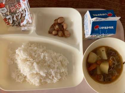 【今日の献立】ごはん 牛乳 肉じゃが とら豆の煮もの