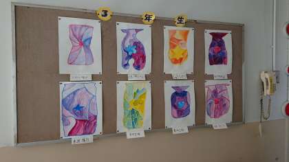 ・3年生は絵の具の水の量を調整しながら光沢や透明感を工夫した「不思議な花びん」