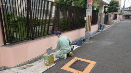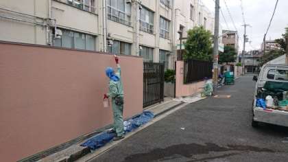 8/24〜9/4の日程で、教育委員会の営繕グループの方々が正面の門と柵や壁をペンキで塗りなおしています。体温を超える熱気の中ですが、天下茶屋小学校のためにがんばっていただいています。早くきれいになった学校を見ていただきたいです。