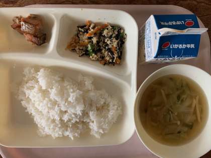 【今日の献立】ごはん 牛乳 さけのしょうゆ風味焼き 五目汁