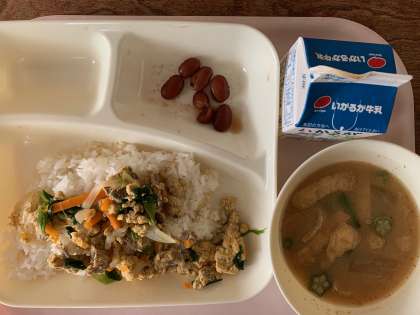 【今日の献立】他人丼 牛乳 とうがんのみそ汁 金時豆の煮もの