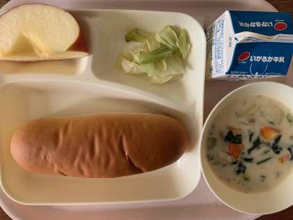 【今日の献立】黒糖パン 牛乳 きのこのクリームシチュー キャベツの