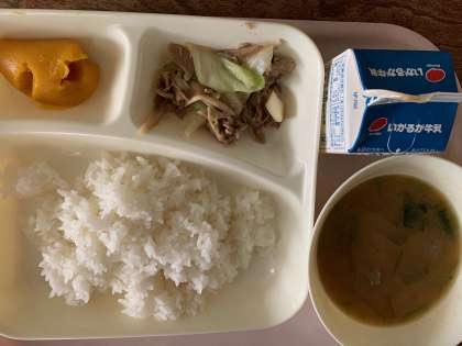 【今日の献立】ごはん 牛乳 豚肉とまいたけのいためもの つみれ汁