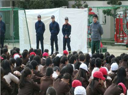 時折、小雪のちらつく寒い校庭での学習でしたが、真剣に話を聞き、特に、体験に出た高学年の代表の人たちが感想をみんなに向けてしっかり発表できていました。