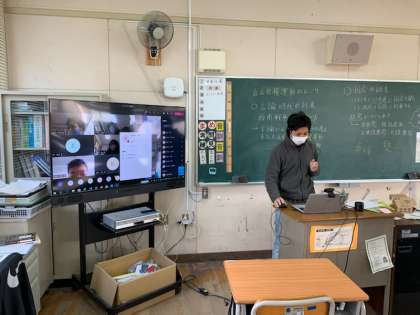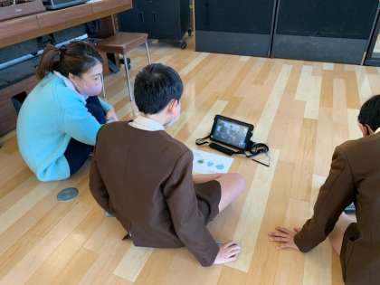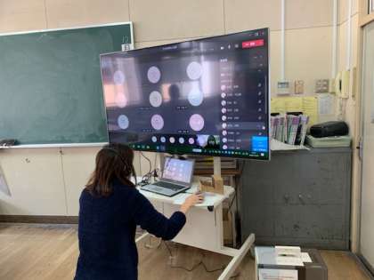 今日は6年生だけの土曜授業です。3時間目の算数は、おうちで授業を受ける児童と学校に残り別教室で授業を受ける児童に分かれてオンライン学習に取り組みました。「およその面積を求めよう」というテーマで、甲子園球場が自分たちの知っている図形のうちどれに近いかを発表し合う授業です。真上から描いた甲子園球場のイラストが、円や長方形、三角形、台形などどの形に近いかを考えていきました。2組では「台形」と「円」の2通りの考えが出てきました。次の時間にはタブレットを使って、長さを割り出し、面積を求めていきます。ご協力ありがとうございました。