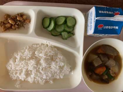 【今日の献立】ごはん 牛乳 鶏肉と野菜の煮もの じゃこ豆