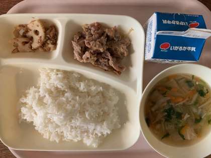 【今日の献立】ごはん 牛乳 豚肉のねぎじょうゆ焼き すまし汁 れんこ